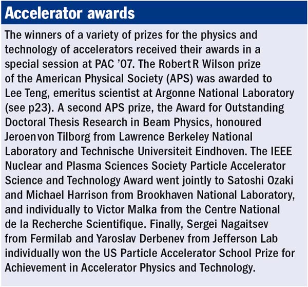 The conference also heard reports on the commissioning of multibatch slip-stacking in the Fermilab main injector. This technique has allowed doubling of the neutrino intensity for the Neutrino beam for the Main Injector (NUMI) project. Incorporating the Recycler for proton accumulation yields a four-fold increase in the neutrino source and may lead to a project dubbed SuperNUMI, although this could face strong competition from the Japan Proton Accelerator Research Complex (J-PARC) and an upgraded CERN Neutrinos to Gran Sasso (CNGS) project. Further steps will be necessary to ensure a leading position for the US in long-baseline neutrino experiments, such as Fermilab’s proposed Project X.