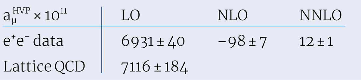 The HVP contribution can readily be computed using lattice QCD in Euclidean space with space-like four-momenta in the photon loop, thus yielding the real part of the HVP directly. The dispersive result is currently more precise (see “Off the mark” figure”), but further improvements will depend on consistent new e+e– scattering datasets.