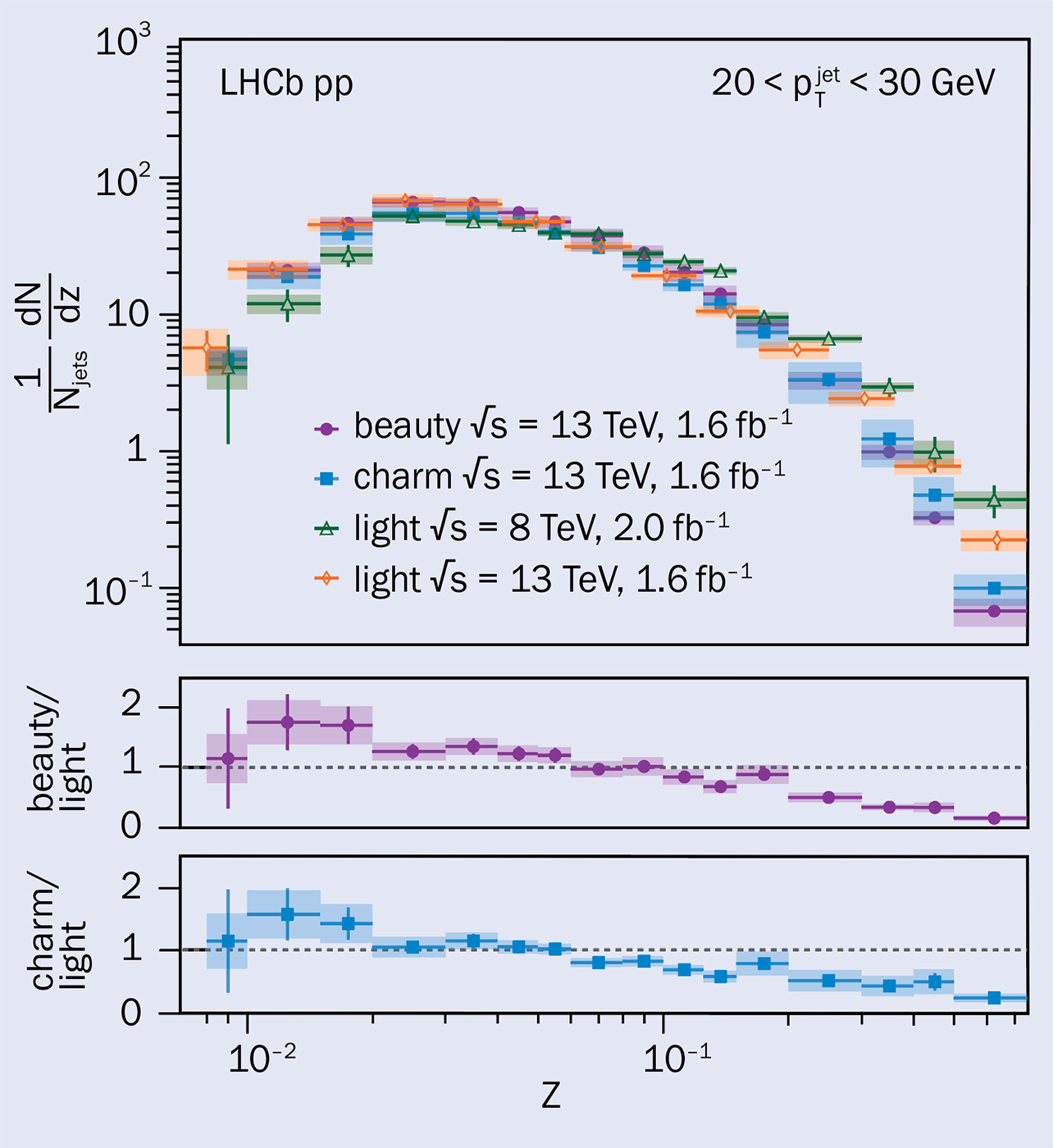 Previously, the LHCb collaboration measured observables sensitive to fragmentation functions in samples dominated by light-quark-initiated jets. The same measurements were recently carried out for charm- and beauty-quark-initiated jets, allowing a direct comparison of hadronisation across three different jet flavour categories at a single experiment. The light-quark sample was obtained by selecting jets produced nearly back-to-back with a Z boson. In such events, the single parton initiating the jet is typically a gluon or a light quark. In the forward kinematic region accessible to the LHCb detector, where one incoming parton often carries a large fraction of the proton momentum, the proportion of light-quark jets gets further enhanced. Samples of predominantly charm- and beauty-quark-initiated jets were instead obtained using a dedicated flavour-tagging algorithm, which makes use of LHCb’s excellent performance at heavy flavour identification and reconstruction.