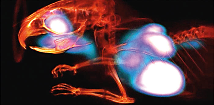 Following this, CC collaboration members developed and constructed several dedicated PET prototypes. The first, which was later commercialised by Raytest GmbH in Germany under the trademark ClearPET, was a small-animal PET machine used for radiopharmaceutical research. At the turn of the millennium, five ClearPET prototypes characterised by a spatial resolution of 1.5 mm were built by the CC collaboration, which represented a major breakthrough in functional imaging at that time. The same crystal modules were also developed by the CC team at Forschungszentrum Jülich, Germany, to image plants in order to study carbon transport. A modified ClearPET geometry was also combined with X-ray single-photon detectors by CC researchers at CPPM Marseille, offering simultaneous PET and computed-tomography (CT) acquisition, and providing the first PET/CT simultaneous images of a mouse in 2015 (see image above). The simultaneous use of CT and PET allows the excellent position resolution of anatomic imaging (providing detailed images of the structure of tissues) to be combined with functional imaging, which is sensitive to the tissue’s metabolic activity.