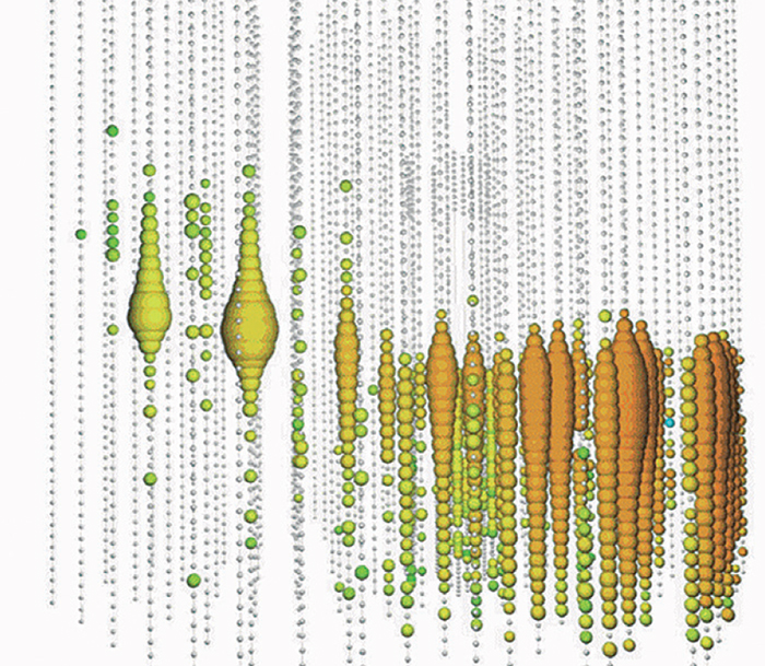 This is an event view of the highest energy neutrino detected so far by the IceCube experiment based at the South Pole (CERN Courier December 2014 p30). Each sphere is one optical sensor; the coloured spheres show those that observed light from this event. The sizes show how many photons each module observed, while the colour gives some idea of the arrival time of the first photon, from red (earliest) to blue (latest). It is easy to see that the neutrino is going slightly upward (by about 11.5°), so the muon cannot be from a cosmic-ray air shower; it must be from a neutrino. The event, detected on 11 June 2014, was in the form of a through-going muon, which means that the track originated and ended outside of the detector’s volume. So, IceCube cannot measure the total energy of the neutrino, but rather its specific energy loss (dE/dx). While the team is still working on estimating the neutrino energy, the total energy loss visible in the detector was 2.6±0.3 PeV.