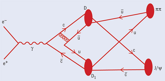 The clue to the nature of this meson appears to be that the mass of the Y meson (4260 MeV) is near the threshold for the production of DD1 – the combination of pseudoscalar (D) and axial (D1) charmed mesons (figure 2). This is the first channel in e+e– annihilation where charmed meson pairs can be produced with no orbital angular momentum (i.e. via S-wave processes). Thus at threshold there is no angular-momentum barrier against a DD1 pair being created effectively at rest, and rearranging their constituents into the form of J/ψ and light flavours (the latter then seeding pions). Thus the structure could simply be a threshold effect rather than a true resonance, or an exotic “molecule” made of D and D1 charmed mesons.