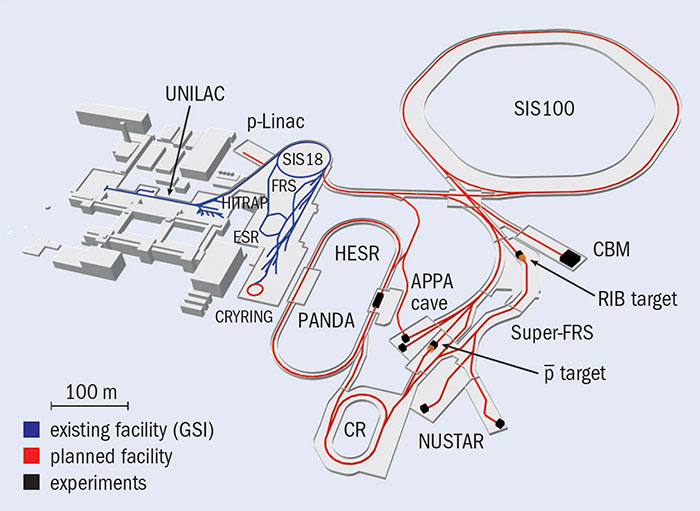 The FAIR accelerator complex is optimised to deliver intense and energetic beams of particles to different production targets. The resulting beams will then be steered to various fixed-target experiments or injected into storage-cooler rings for novel in-ring experiments with beams of secondary antiprotons or radioactive ions at the highest beam qualities. The central machines of FAIR are: the fast-ramping SIS100 synchrotron, which provides intense primary beams; the large-aperture Super Fragment Separator (Super-FRS), which filters out the exotic ion beams; and the cooler storage rings CR and HESR (see image). The SIS100 is the heart of FAIR. With a circumference of 1.1 km and a maximum magnetic bending power of 100 Tm, the machine will accelerate ion beams with maximum intensities ranging from 4 × 1013 protons at 29 GeV to 5 × 1011 uranium (28+) ions at 2.7 GeV/u. The existing GSI accelerators UNILAC and SIS18 will serve as injectors and pre-accelerators for SIS100, while a new proton linac will be installed for high-intensity injection into the SIS18/SIS100 synchrotron chain.