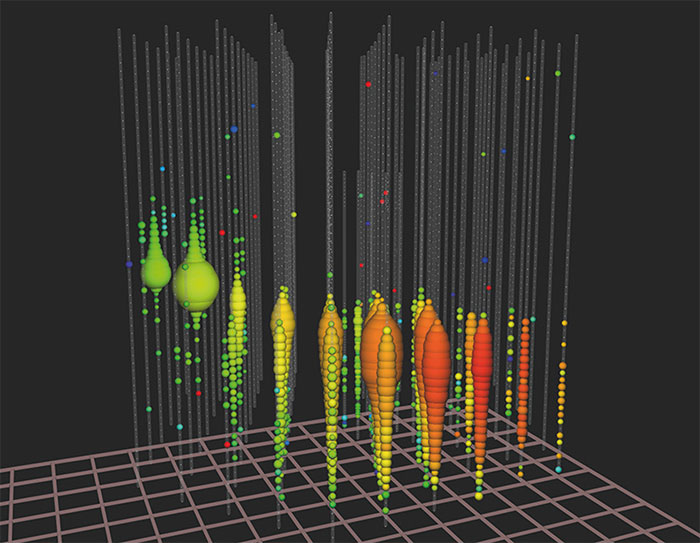To speed up data collection, an expanded IceCube collaboration is planning a greatly enhanced instrument (see image of the proposed Gen2 array) with multiple elements: an enlarged array to search for high-energy astrophysical neutrinos; a dense infill array to determine the neutrino properties (PINGU); a larger surface air-shower array to veto downgoing atmospheric neutrinos; and possibly an array of radio detectors targeting neutrinos with energies above 1017 eV. Most importantly, thanks to the clarity of the Antarctic ice, we would be able to increase the instrumented volume of this next-generation array by a factor of 10 without a corresponding increase in the number of deployed sensors – or in the cost. The Gen2 proposal would therefore see an instrumented volume of approximately 10 km3 comprising strings of optical modules, but with improved hardware and deployment methods compared with IceCube.
