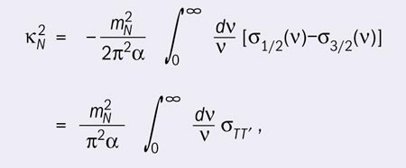 The internal structure of the nucleon is responsible for its ground-state properties, such as hadronic and electromagnetic form factors and the anomalous magnetic moment, while at higher energies this finite internal structure creates a series of resonances in the mass region of 1-2 GeV, as shown in figure 2. The ground-state properties and the resonance spectra are not all independent phenomena, however; they are related by a number of sum rules. One of these is the Gerasimov-Drell-Hearn (GDH) sum rule (see equation 1), which connects the magnetic moments of the nucleons and their helicity structures in the resonance region. The derivation of this sum rule is based on general principles: Lorentz and gauge invariance, crossing symmetry, causality and unitarity. The only assumption in deriving equation 1 is that the scattering amplitude goes to zero in the limit, photon energy ν→∞, thus there is no subtraction hypothesis.