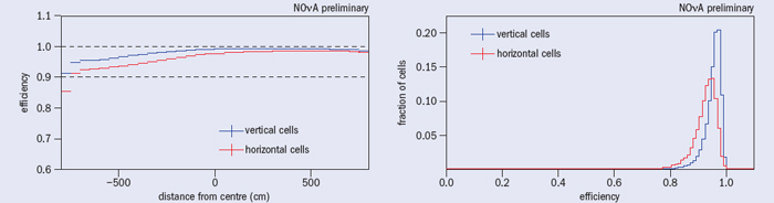 This large-scale assembly project is now finished. The last detector block was put in place in February of this year and the last of the 11 million litres of scintillator made for the experiment was delivered in April. While the task of outfitting the detector with electronics is continuing through the summer, the experiment recorded its first neutrino event in November last year, and has analysed millions of cosmic-ray tracks. This analysis has verified that the scintillator, PVC, fibre and electronics work together as designed to move the scintillation light from the far end of the detection channels to where it can be recorded. As figure 3 shows, the efficiency for detecting a minimum-ionizing particle crossing a cell at the furthest end from the read-out is above 90%, which is key to the tracking and particle-identification performance of the detector.