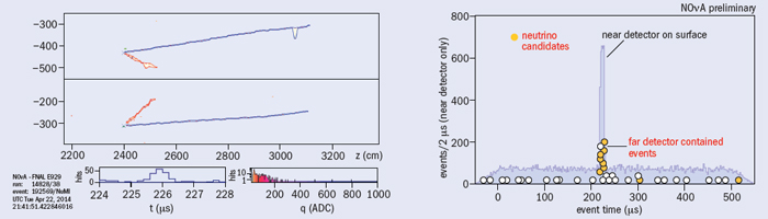 Cosmic-ray interactions are an excellent source for detector calibration, but they are also a potential background to the neutrino selection. While the NuMI beam is delivered in regular bursts, 10 μs in duration, the high cosmic rate on the surface means that about 1.5 cosmic interactions are expected in the detector during the spill. On the other hand, after oscillations, a NuMI neutrino interacts in the far detector once every 12,000 spills, or only about once every four hours. Containment and directional cuts suppress the cosmic rate by about a factor of 105, with only minimal loss of neutrino events. Figure 4 shows a charged-current νμ interaction identified in the NOvA far detector, along with two cosmic-ray muons zipping through during the beam spill. Figure 5 shows the same event, reconstructed, as well as a timing distribution of other neutrino candidates found in the far detector. The neutrino candidates pile up at the arrival time measured in the NOvA prototype detector delayed by the neutrino flight time between the two sites, confirming that NOvA can identify neutrinos among the cosmic-ray backgrounds.