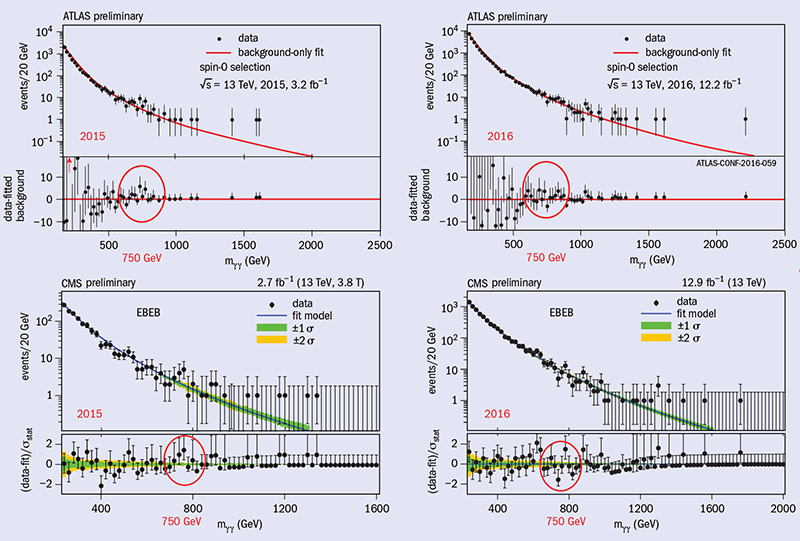 The spectacular performance of the LHC during 2016, which saw about 20 fb–1 of 13 TeV proton–proton collisions delivered to ATLAS and CMS by the time of the conference, gave both experiments unprecedented sensitivity to new particles and interactions. The collaborations reported on dozens of different searches for new phenomena. In a dramatic parallel session, both ATLAS and CMS revealed that their 2016 data do not confirm the previous hints of a diphoton resonance at 750 GeV (figure 1); apparently, those hints were nothing more than tantalising statistical fluctuations. Disappointed theorists were happily distracted by other new results, however. As expected, these include interesting excesses worth keeping an eye on as more data become available. Still in the running for future big discoveries are the production of heavy particles predicted by supersymmetry and exotic theories, and the direct production at the LHC of dark-matter particles. So far, no signs of such particles have been seen at ATLAS or CMS.