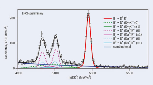 The new analysis is based on 1 fb–1 of available data, aiming to measure the angle γ of the CKM unitarity triangle using B– → D0K*– decays. While B– → D0K– decays have been extensively studied in the past, this is the first time the B– → D0K*– mode has been investigated. The analysis, first presented at CKM2016 (see “Triangulating in Mumbai” in Faces & Places), allows the LHCb collaboration to cross-check expectations for the increase of signal yields in Run 2 using real data. A significant increase, roughly corresponding to a factor three, is observed per unit of integrated luminosity. This demonstrates that the experiment has benefitted from the increase in b-production cross-section, but also that the trigger of the detector performs better than in Run 1. Although the statistical uncertainty on γ from this measurement alone is still large, the sensitivity will be improved by the addition of more data, as well as by the use of other D-meson decay modes. This bodes well for future measurements of γ to be performed in this and other decay modes with the full Run 2 data set.