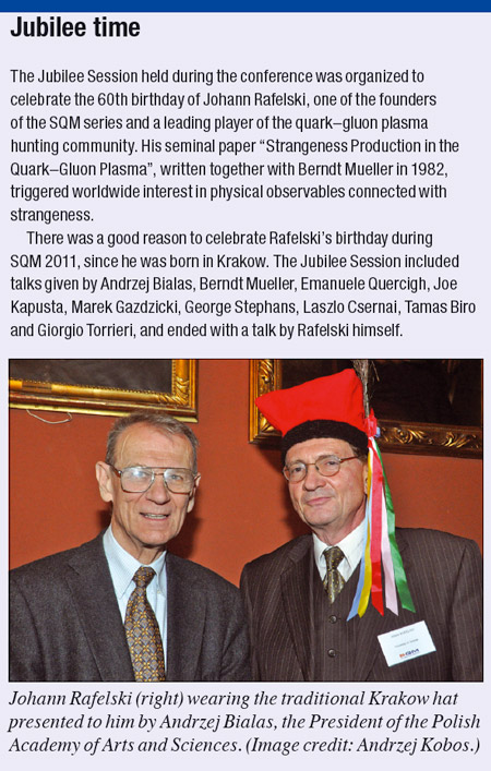 The 13th international conference on Strangeness in Quark Matter (SQM 2011) took place in Krakow on 18–24 September. Organized by the Polish Academy of Arts and Sciences (Polska Akademia Umiejętności, PAU), it attracted more than 160 participants from 20 countries. The emphasis was on new data on the production of strangeness and heavy flavours in heavy-ion and hadronic collisions, in particular the new results from the LHC at CERN and the Relativistic Heavy Ion Collider (RHIC) at Brookhaven. With the new high-quality data on identified particles, SQM 2011 in a sense supplemented the Quark Matter conference that was held in Annecy in May.