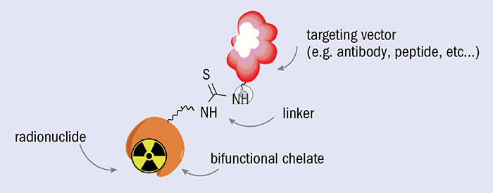 TAT radionuclides must be carefully processed before being used in medical applications. They first must be isolated with high radio-chemical purity from the target material, which can be achieved using classical chemical procedures such as ion exchange, extraction and precipitation. Purified TAT radionuclides are then attached to biomolecule targeting vectors via a bifunctional chelator, which connects the biomolecule with a radionuclide complex (figure 2). The stability of compounds containing alpha-emitting radionuclides is a challenge because after decay most of the daughter isotopes are radioactive elements that no longer remain chelated. Moreover, the radioactive daughters can accumulate and cause unwanted toxicity in healthy organs, especially those involved in excretion such as the liver and kidneys. These issues have driven demand for a more robust and stable chelation system and/or encapsulation methods that contribute to an optimised pharmacokinetic profile with rapid cell internalisation. By doing so, the hope is to keep radioactive daughter nuclei proximal to the original decay site and thus close to the targeted tissue.