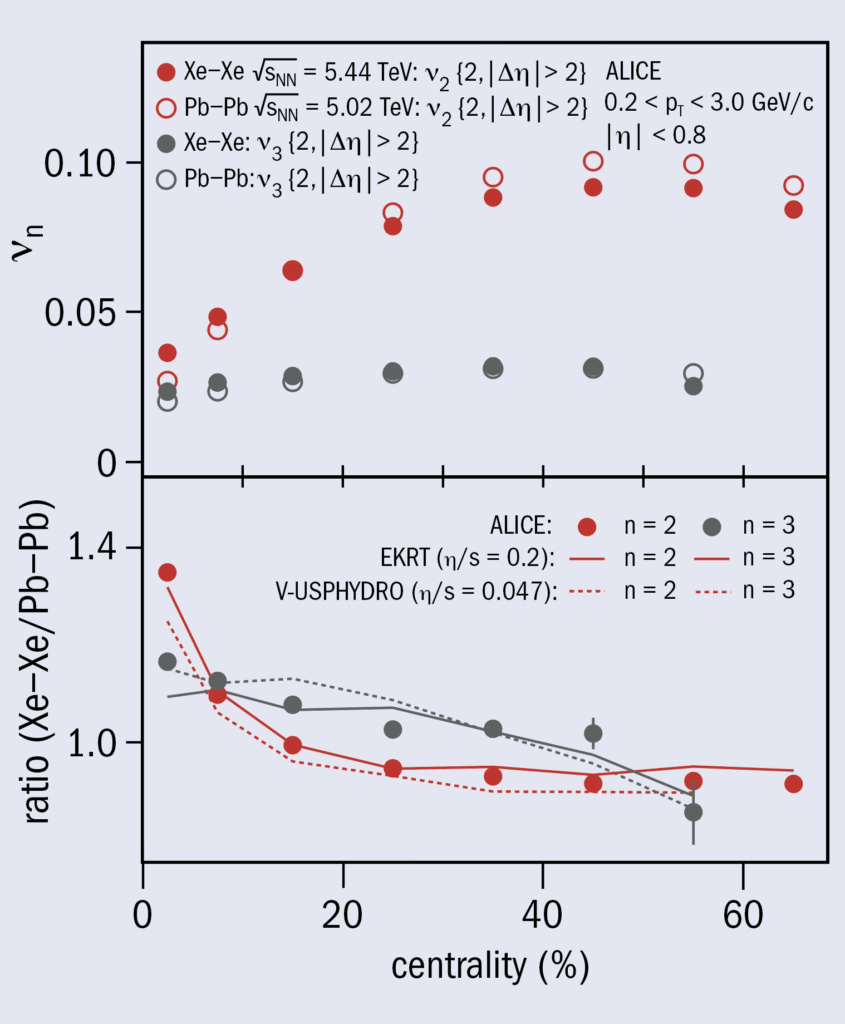 The figure shows measurements of νn vs centrality for both Xe–Xe and Pb–Pb collisions. Centrality is a measure of the degree of overlap in heavy-ion collisions, where 0% corresponds to collisions that are head-on, and for 100% the heavy-ions do not overlap enough to interact. For mid-central collisions (20–70%), the second harmonic coefficients of the initial matter distributions are predicted to be very similar for Xe–Xe and Pb–Pb from various initial-state models. At the same centrality, however, the Xe–Xe system size is smaller than Pb–Pb and the impact of a finite η/s suppresses ν2 by 1/R, where R corresponds to the transverse size of the system. Therefore, ratios of Xe–Xe/Pb–Pb ν2 coefficients in the mid-centrality range could be directly sensitive to η/s, with larger values of η/s leading to a greater suppression of this ratio. When comparing our data to two different hydrodynamic models, which use parameters of η/s close to the values from AdS/CFT calculations, we find a good agreement with the data.