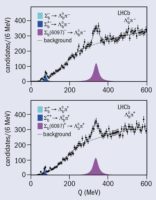 LHCb physicists have recently observed, for the first time, two new baryons. These states, named Σb(6097)+ and Σb(6097), occur as resonances appearing in the two-body system Λb0π±, which consists of a neutral Λb0 baryon and a charged π meson (see figure). The statistical significances of the observations are 12.7σ and 12.6σ, well above the threshold for discovery.