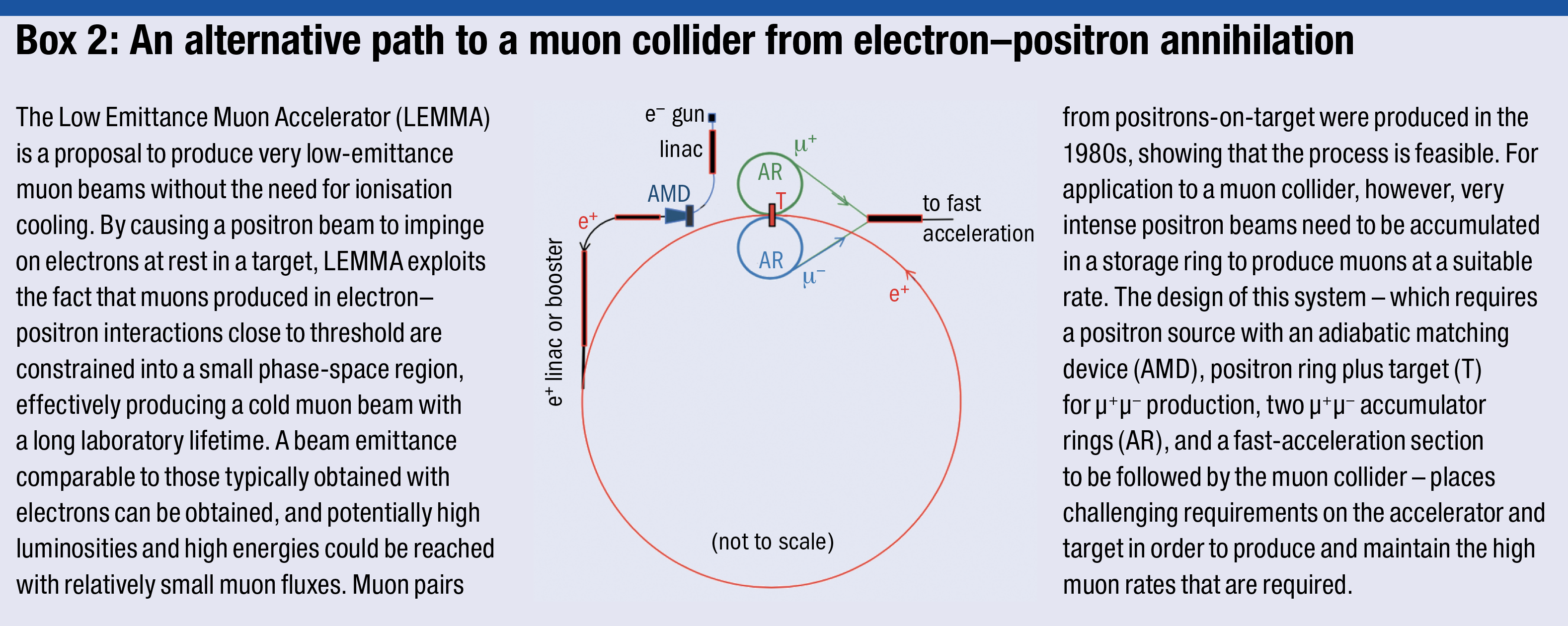 An alternative path to a muon collider called the Low Emittance Muon Accelerator (LEMMA), recently proposed by accelerator physicists at INFN in Italy and the ESRF in France, provides a naturally cooled muon beam with a long lifetime in the laboratory by capturing muon–antimuon pairs created in electron–positron annihilation (see box 2).